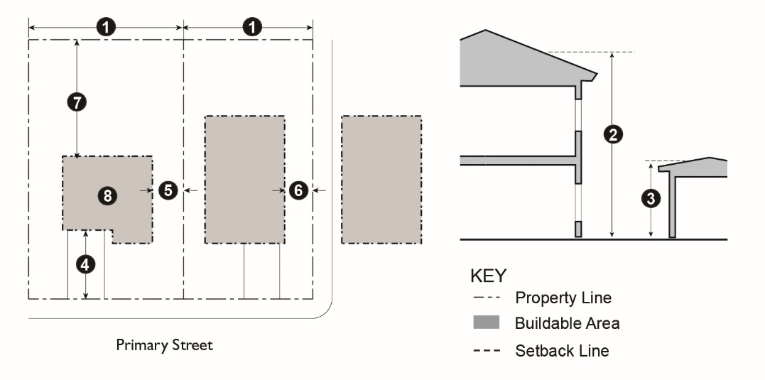 Table 15.04.201.030 prescribes the development standards for the RH, RL1 and RL2 districts. Additional regulations are denoted in a right hand column. Section numbers in this column refer to other sections of this article, while individual letters refer to subsections that directly follow the table. The numbers in each illustration below refer to corresponding regulations in the "#" column in the associated table.