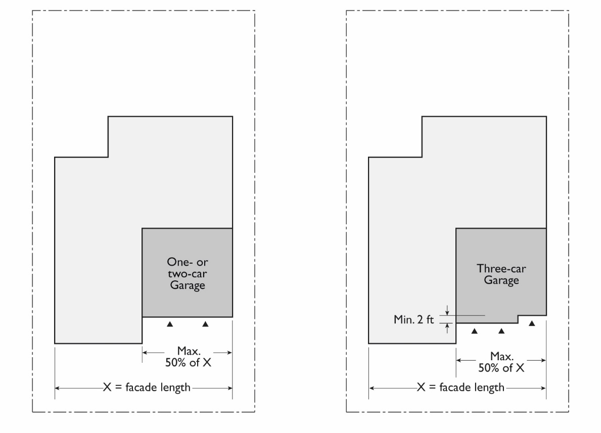 On front facades with both a two car garage and a separate single car garage, the facades of the two garages must be offset a minimum of two feet.