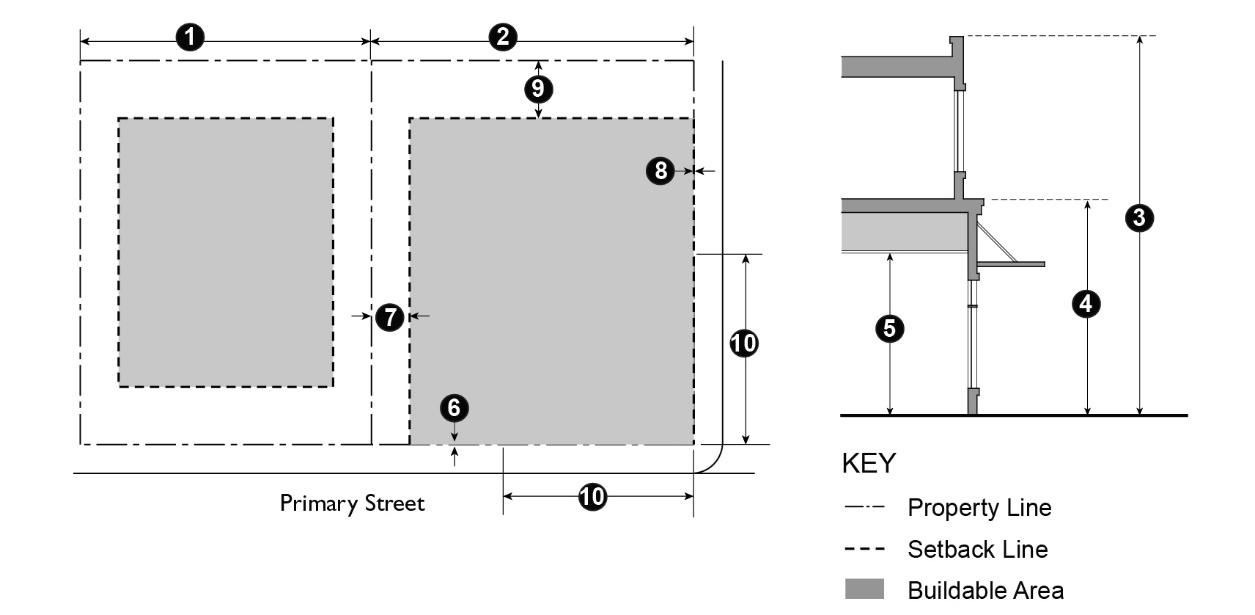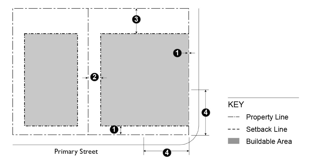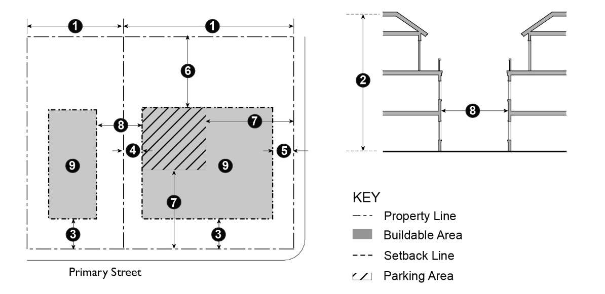 Table 15.04.201.050 prescribes the development standards for the RM Districts. Additional regulations are denoted in a right hand column. Section numbers in this column refer to other sections of this article, while individual letters refer to subsections that directly follow the table. The numbers in each illustration below refer to corresponding regulations in the "#" column in the associated table.