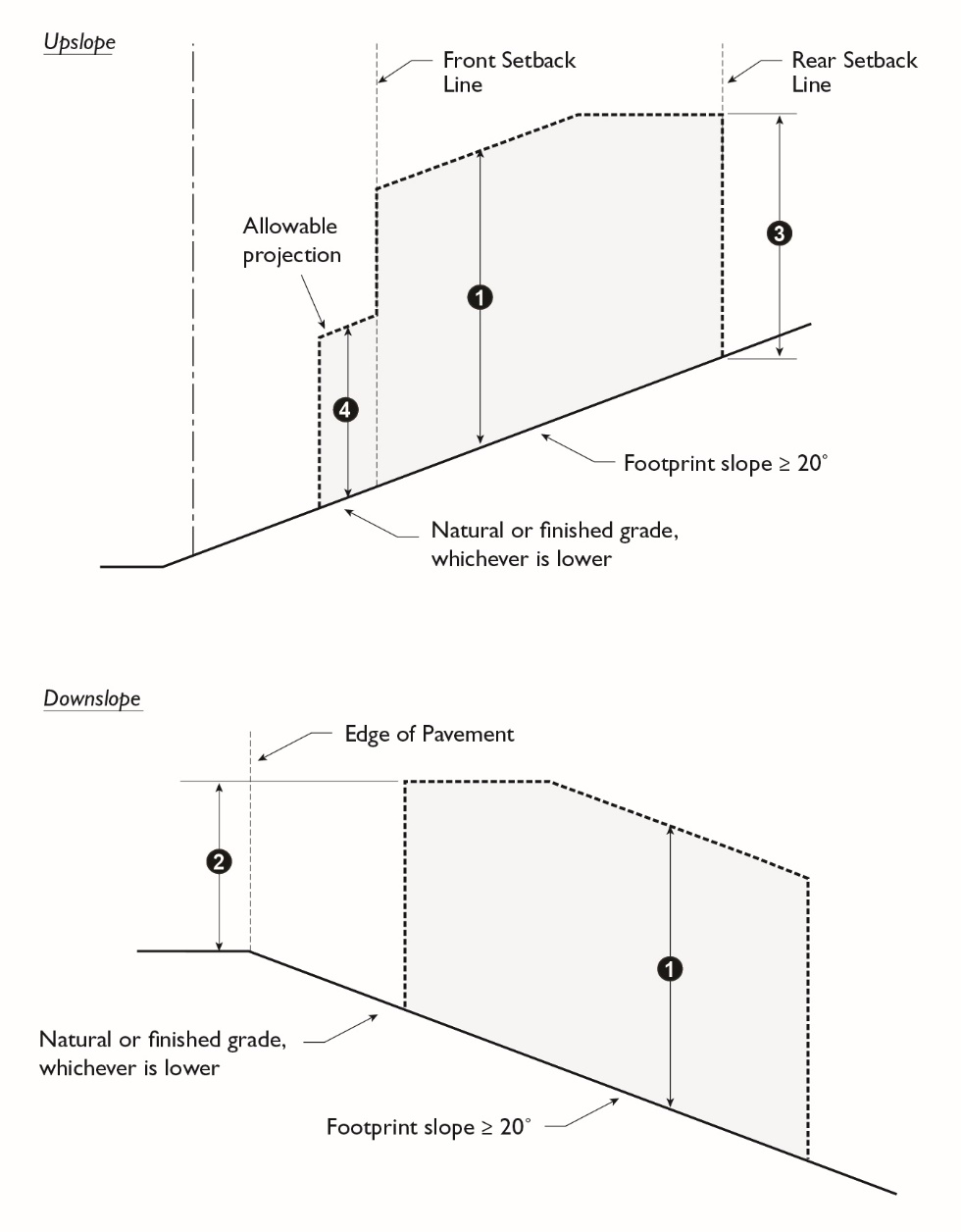 Ground Floor Front Setback. Where the adjoining lots on the same block face have been improved with buildings, the minimum ground floor front setback requirement shall be the average of the actual front setback of these abutting improved lots on such block face or 20 feet, whichever is less. When the lot slope is 20 percent or more, the front setback may be reduced to 10 feet provided the garage door is setback 18 feet from the edge of the pavement.