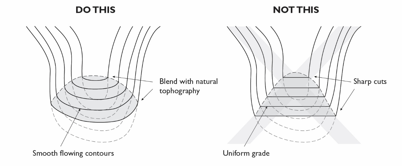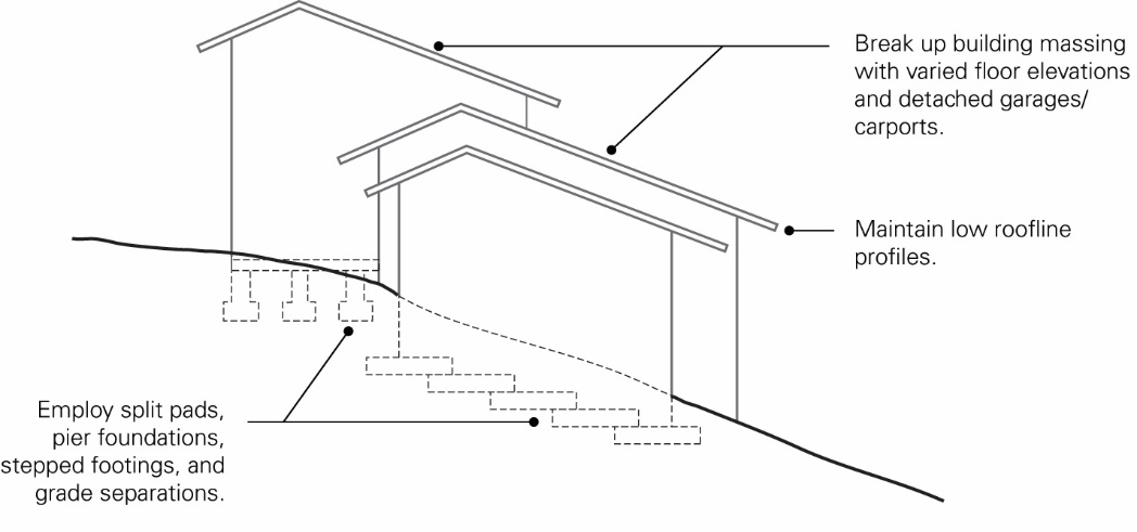 Development shall be subordinate to and blend harmoniously with the natural and open space qualities of the surrounding area where it is located. The alteration of natural topography, vegetation, and other characteristics by grading, excavating, filling or other development activity shall be minimized, and successive padding or terracing of building sites shall be avoided. In all cases, appropriate landscaping, preservation of vegetation, design, and building materials shall be required by the City to reduce as much as practicable the visibility of development.