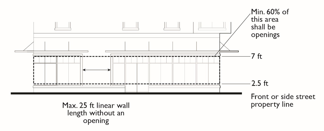 No street-facing façade shall run in a continuous plane of more than 25 feet without a window or a projection, offset, or recess of the building wall at least one foot in depth. Building entrances and front porches, and projections into required front or street side yards such as stoops, bays, overhangs, fireplaces, and trellises count towards this requirement.