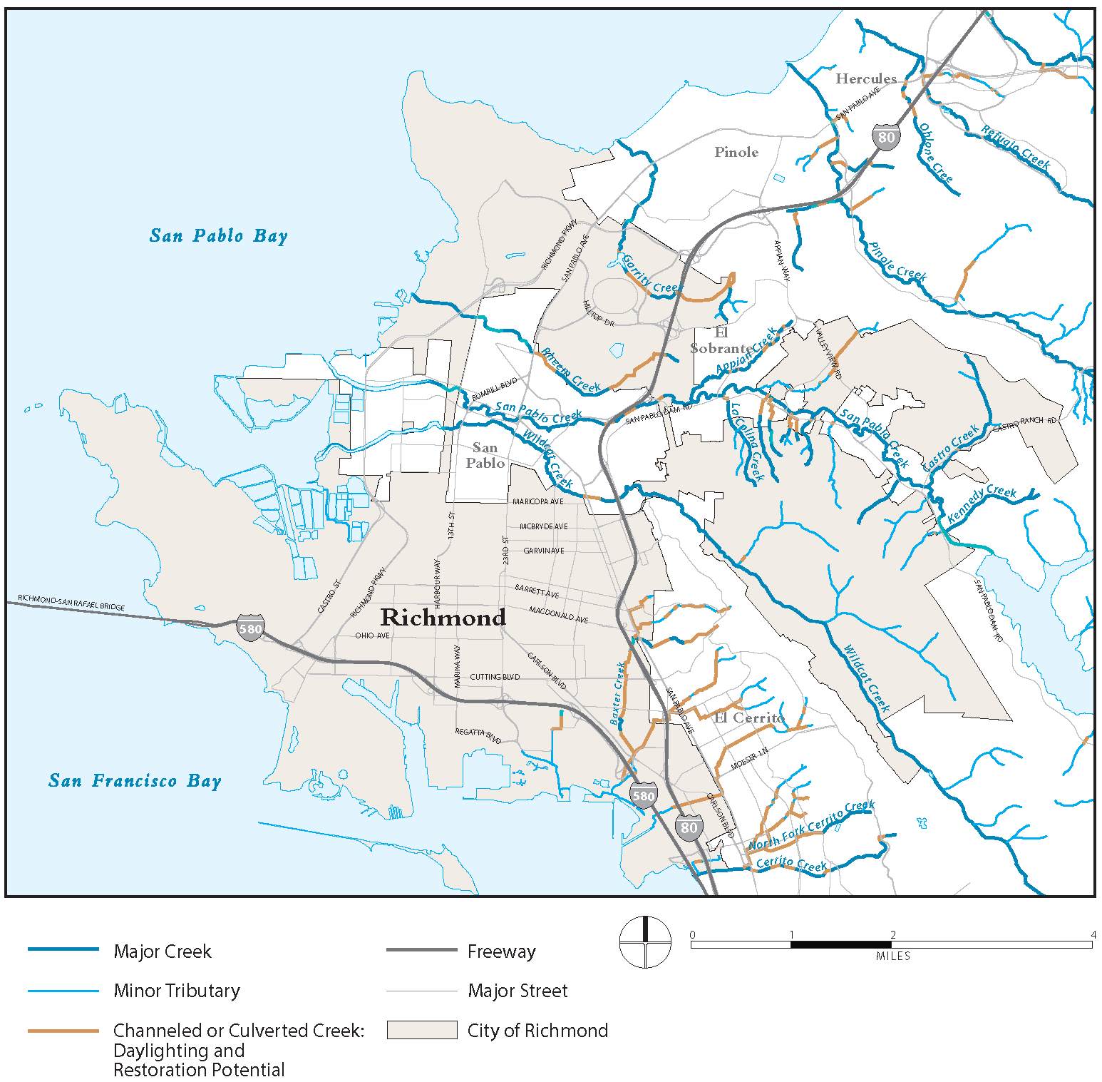 Flatland topography may consist of creeks in a shallow bowl or "U" shaped topography. Generally, these creeks flow from the hills toward the San Francisco Bay and San Pablo Bay following the slope of the land.