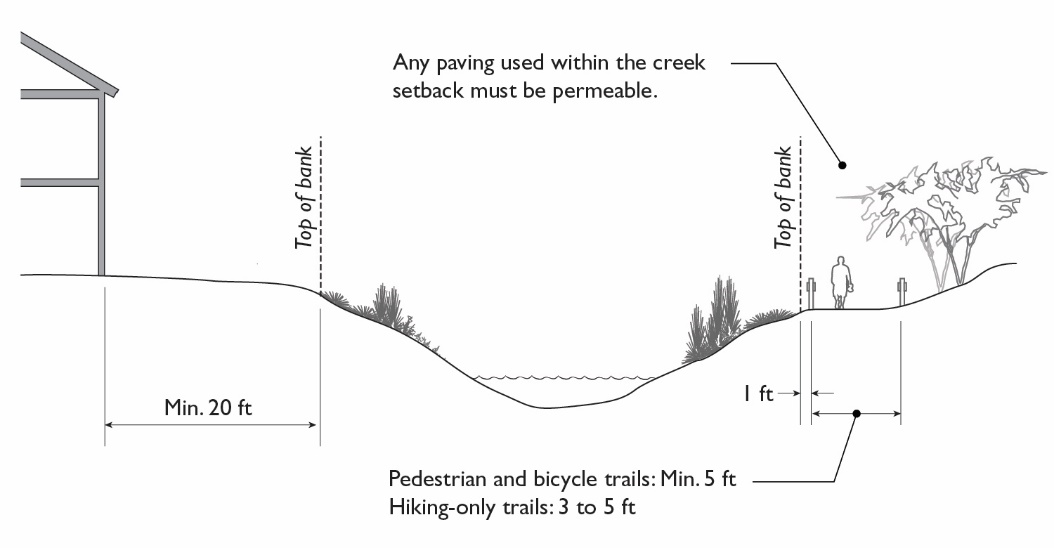 Pedestrian and bicycle trails and greenbelts within the creek setback shall be a minimum five feet in width, and hiking-only trails may be a three to five feet in width.