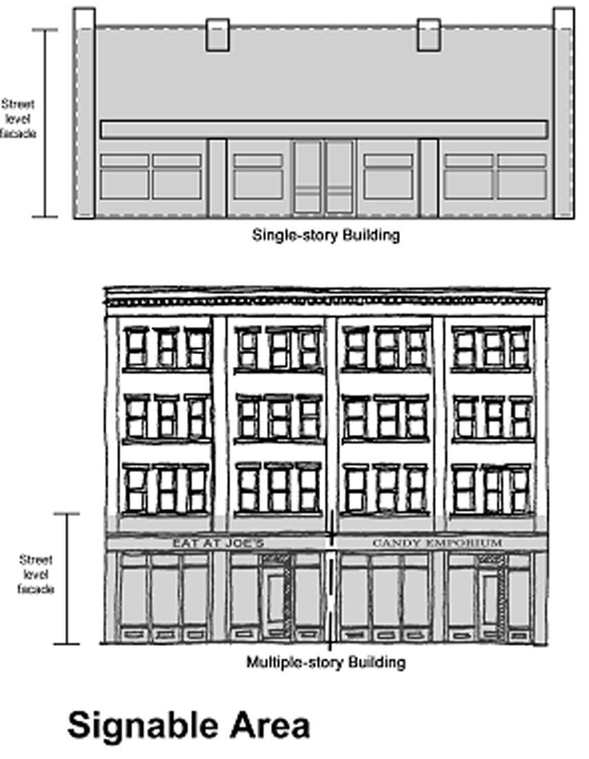 Signable area. The signable area of a building shall equal the area of the building's street level facade (see illustration).