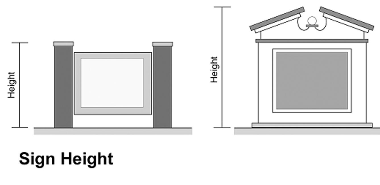 Sign height. The distance from the average level of the ground or pavement directly below the sign to the highest point of the sign structure, including any supportive or decorative elements (see illustration).