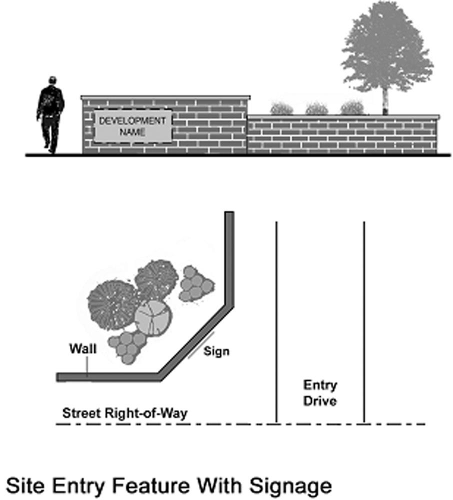 Site entry features with signage. Site entry features with signage may be erected at the entrance to a residential subdivision, multiple-family residential development, elderly or senior housing development, manufactured housing park, or office, research or industrial park, subject to the following (see illustration):