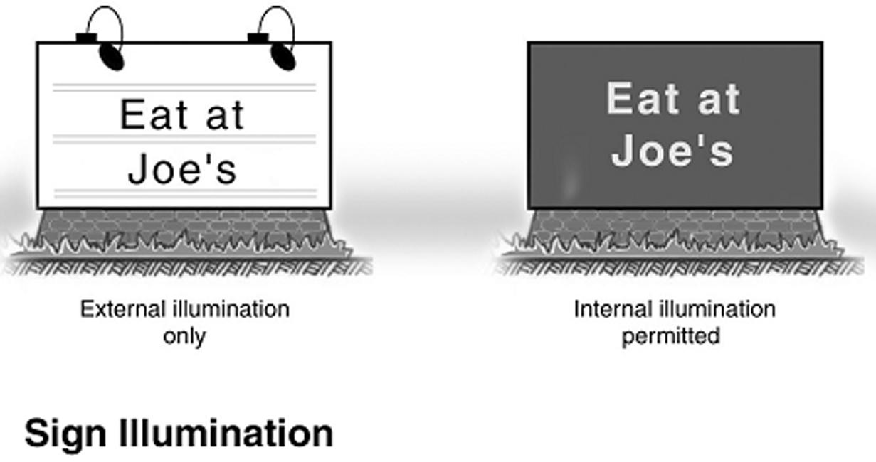 Illumination. Internal and external sign illumination shall be permitted, subject to the standards of article 14 (exterior lighting) and the following (see illustrations):