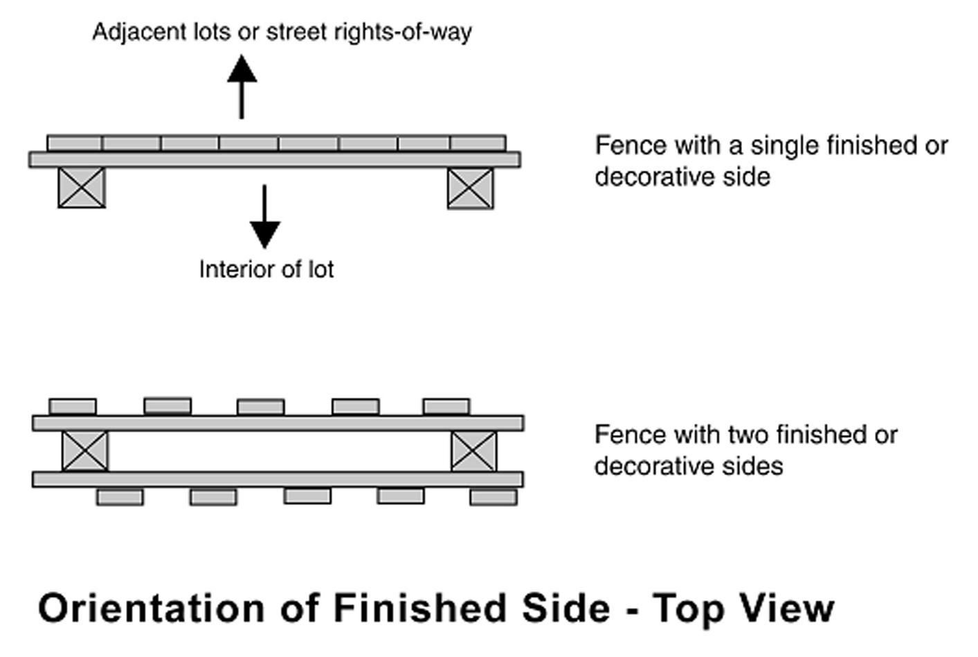 All fences shall be constructed in such a manner that all structural members shall be on the interior side of the fence, including braces, posts, poles, and other projections. Where one side of a fence or wall has a more finished appearance than the other, the side with the more finished appearance shall face the road or adjacent lots (see illustration).