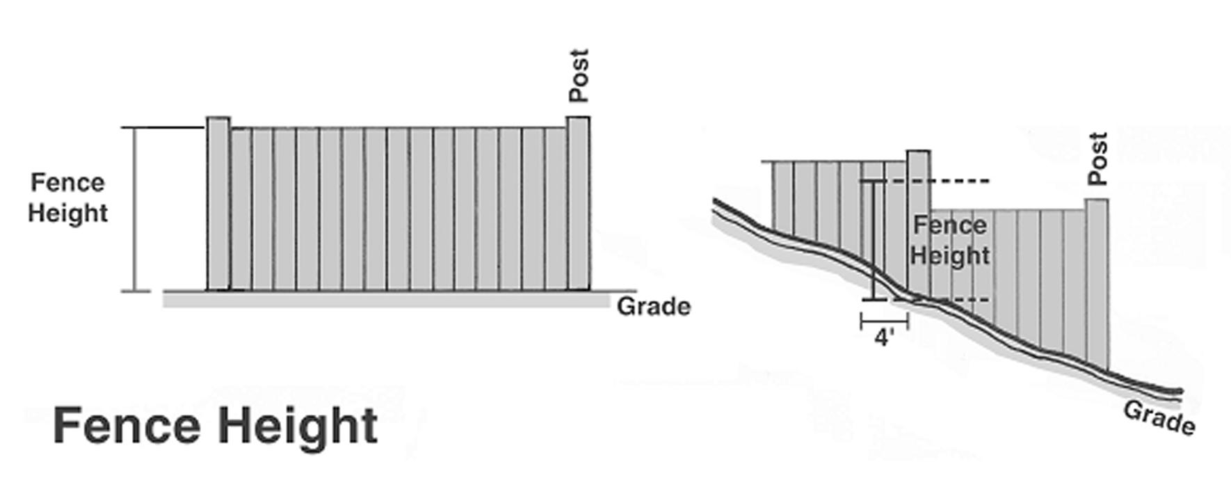 Height, locations, and type of fences permitted. Fence height shall be measured from ground level adjacent to the highest point of the fence. Fill shall not be used for the purpose of achieving a higher fence than otherwise permitted. Where the grade is not level, the maximum fence height shall be equal to the average fence height within four feet of any fence post (see illustration). Standards for maximum height, permitted fence locations, and type of fences permitted shall apply to the following use groups, as specified in section 4.02 (table of permitted uses by district):