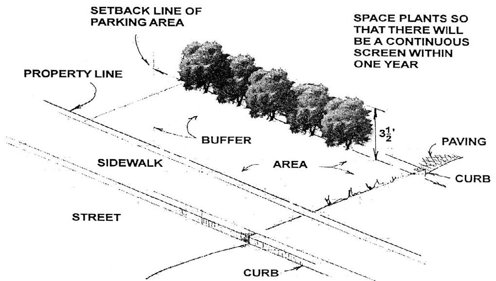 Buffer "A," as shown below, shall have a depth of not less than the minimum yard requirement applicable along each street frontage of the property, but in no case less than five feet, and shall include an evergreen vegetative screen not less than 3½ feet in height at the time of installation placed along the setback line of the parking area. Evergreen vegetative material intended to satisfy this requirement shall be planted at such intervals that will result in a continuous visual screen within one year of planting.