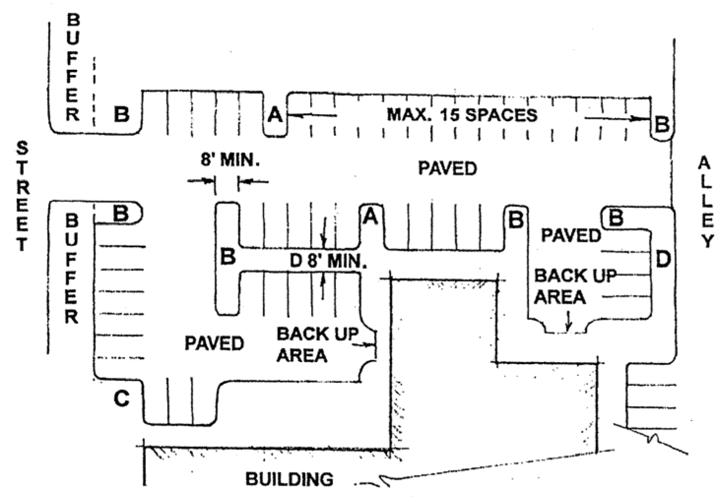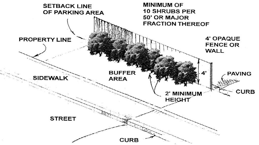 Buffer "B," as shown below, shall have a depth of not less than the minimum yard requirement applicable along each street frontage of the property, but in no case less than five feet, and shall include an opaque structural fence or wall not less than four feet in height placed along the setback line of the parking area and shall include shrubs located adjacent to such fence at a rate of not less than ten for each 50 linear feet or major fraction thereof of buffer along each street frontage.