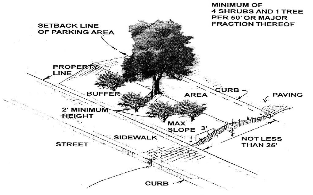 Buffer "D," as shown below, shall have a depth of not less than 25 feet and shall consist of an earthen berm not less than three feet in height with slopes not greater than three feet horizontal for each one foot vertical and shall include trees and shrubs located on the top or street side of such berm at a rate of not less than one tree and four shrubs for each 50 linear feet or major fraction thereof of buffer along each street frontage.