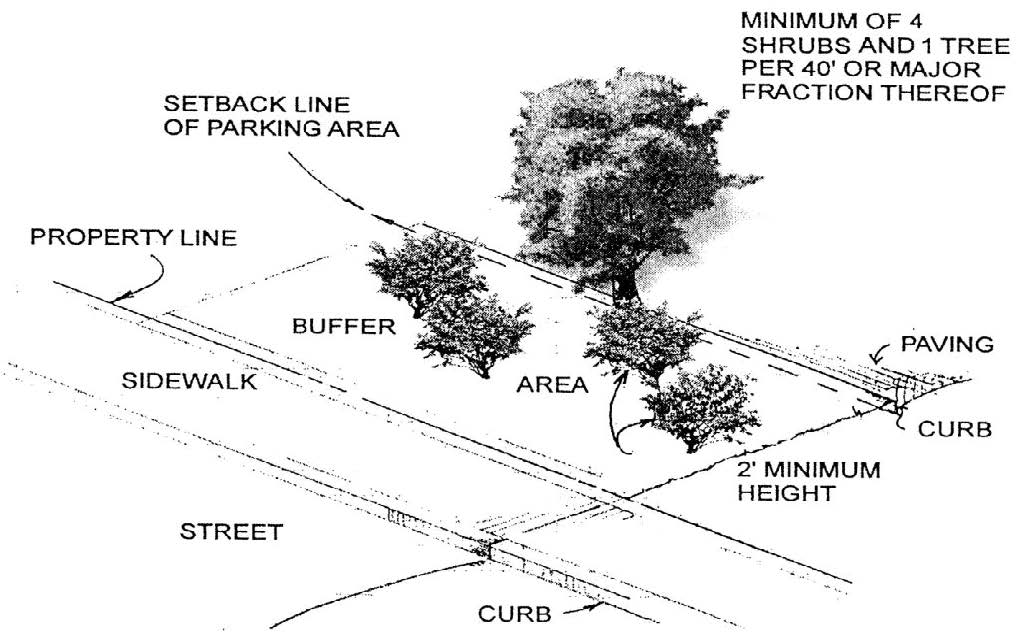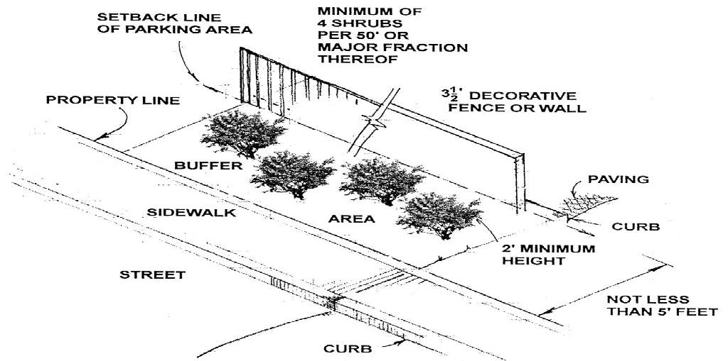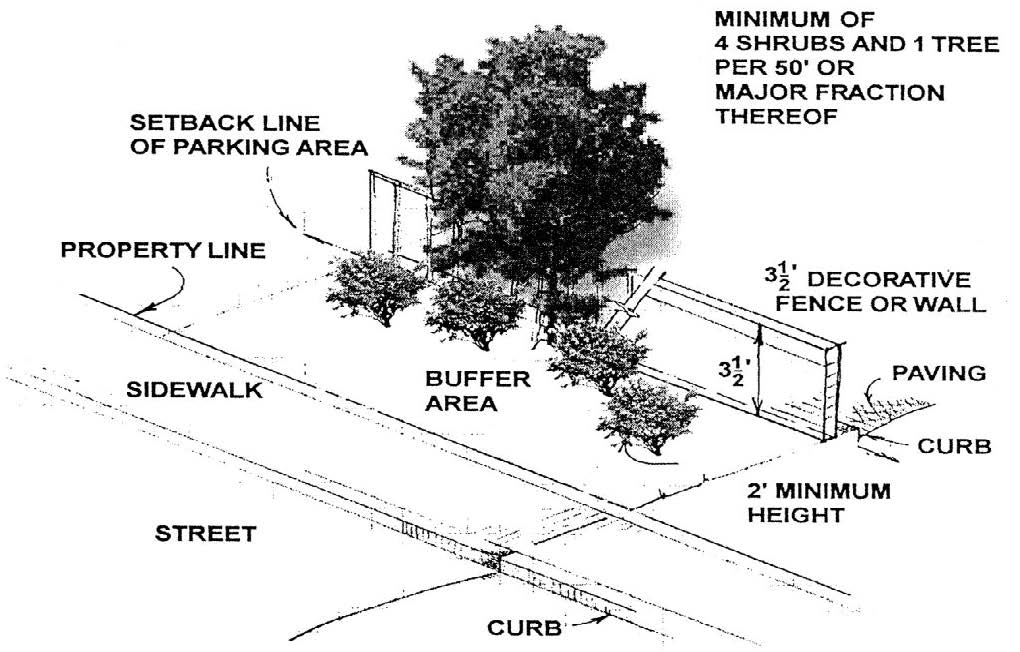Buffer "C," as shown below, shall have a depth of not less than the minimum yard requirement applicable along each street frontage of the property, but in no case less than five feet, and shall include a decorative fence or wall not less than 3½ feet in height placed along the setback line of the parking area and shall include trees and shrubs located adjacent to such fence at a rate of not less than one tree and four shrubs for each 50 linear feet or major fraction thereof of buffer along each street frontage.