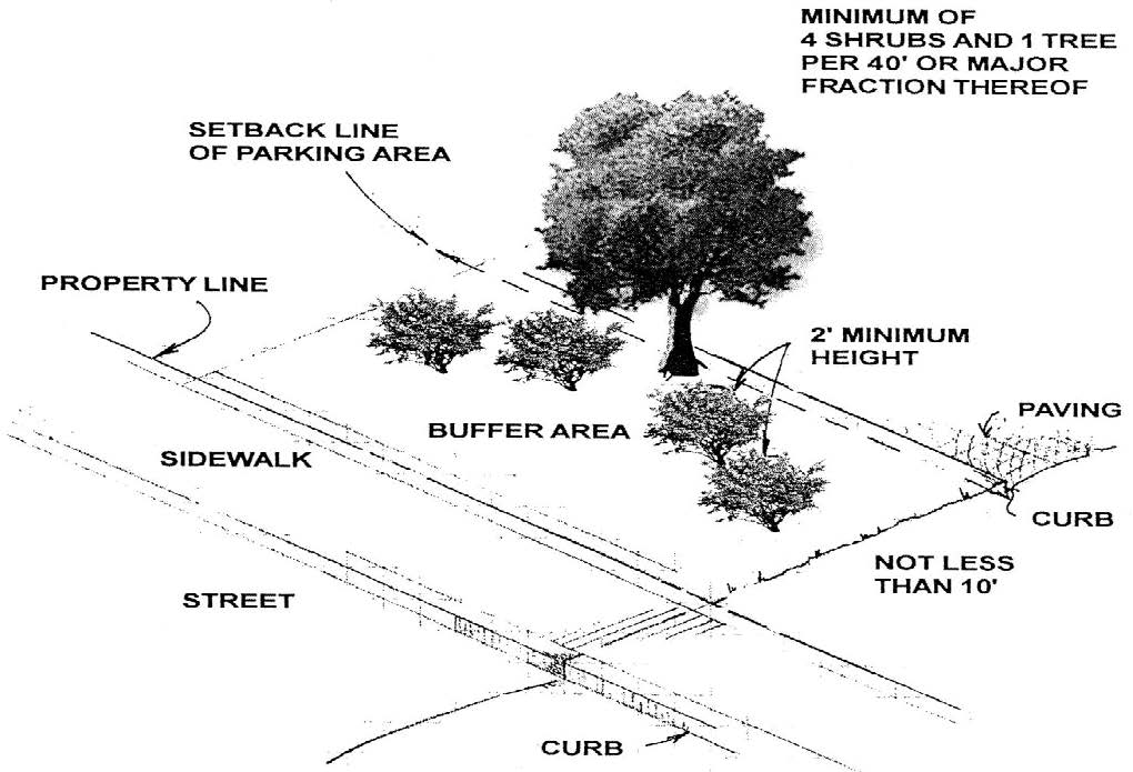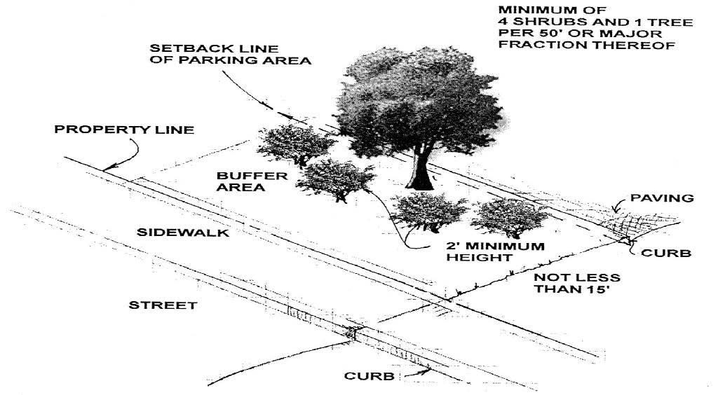 Buffer "F," as shown below, shall have a depth of not less than 15 feet and shall include trees and shrubs at a rate of not less than one tree and four shrubs for each 50 linear feet or major fraction thereof of buffer along each street frontage.