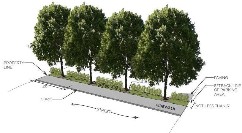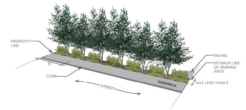 Buffer "I," as shown below, shall have a depth of not less than five feet and shall include either trees classified as medium or large in the Tree Canopy Chart dated November, 2002, adopted by the Planning Commission at a rate of one tree for every 30 linear feet or trees classified as compact or small trees in Tree Canopy Chart dated November, 2002, adopted by the Planning Commission at a rate of one tree for every 20 linear feet; as well as groundcover or shrubs covering at least 50 percent of the area of the buffer along each street frontage.