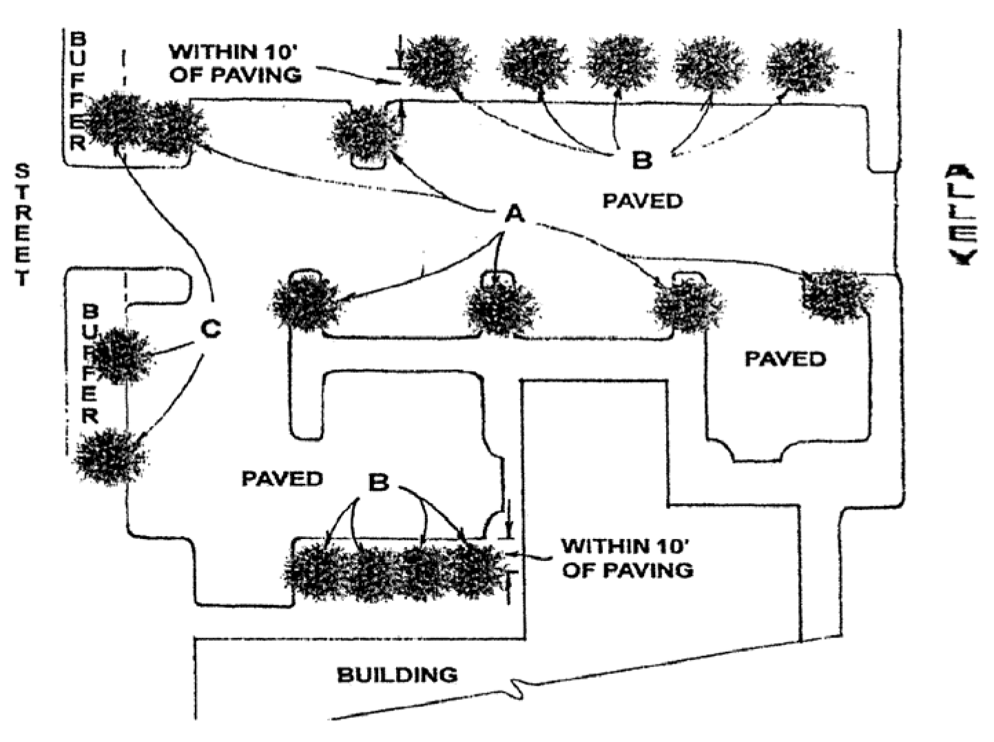 Between the area devoted to parking and a building on the same site, or between the area devoted to parking and a side or rear property line, provided such trees are located within ten feet of the area devoted to parking; or