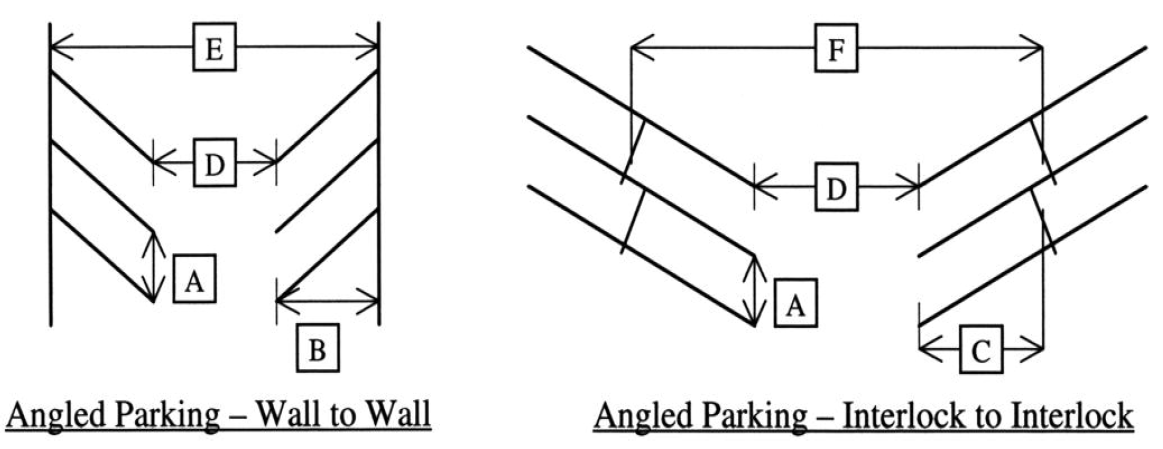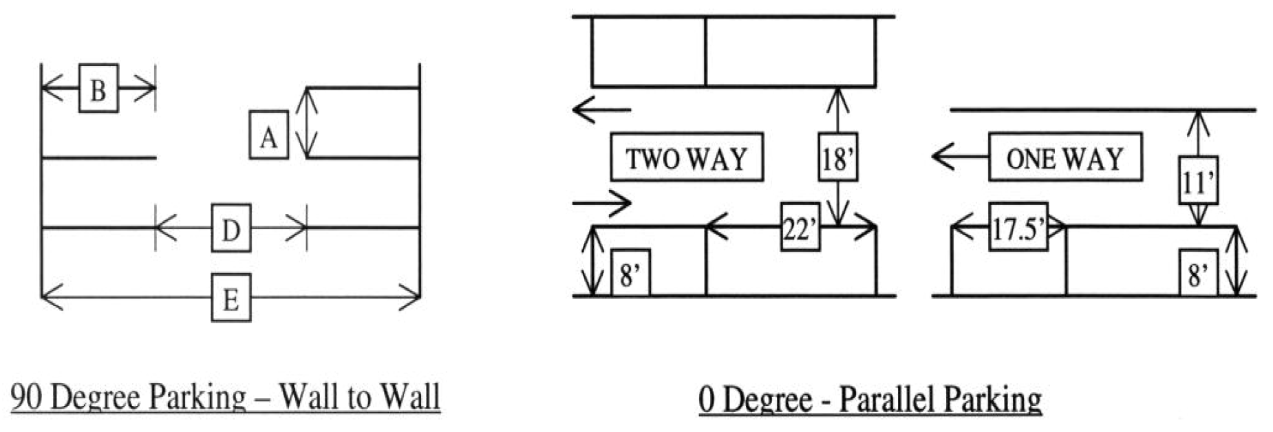 The minimum aisle width for two-way traffic shall be 18 feet. Captive stalls for parallel parking shall be 22 feet in length. End stalls for parallel parking shall be 17½ feet in length. The Zoning Administrator may interpolate dimensions for angles not listed above.