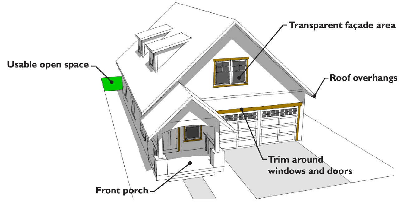 A front door visible from the street (applies only to front-loaded lots less than fifty feet wide).