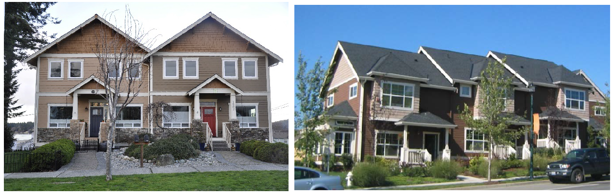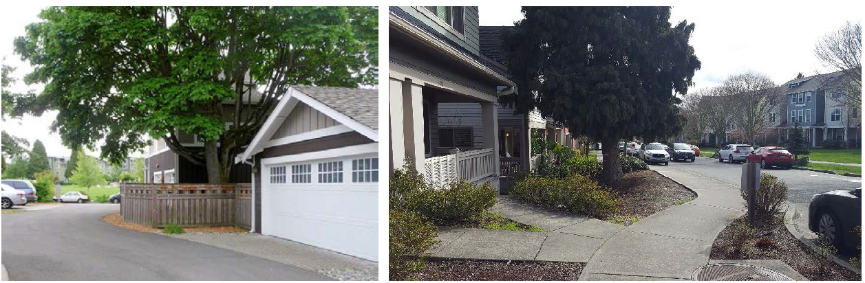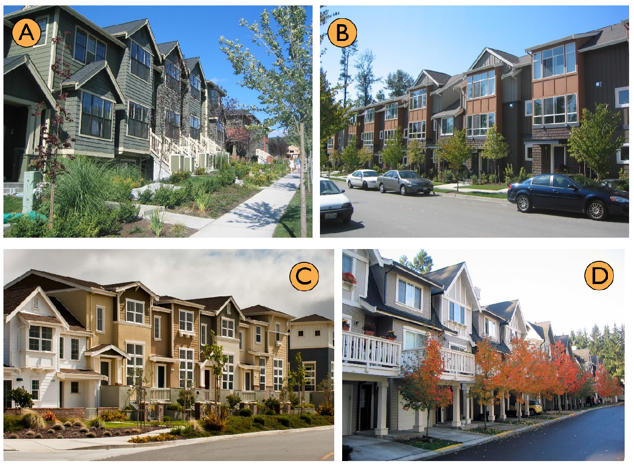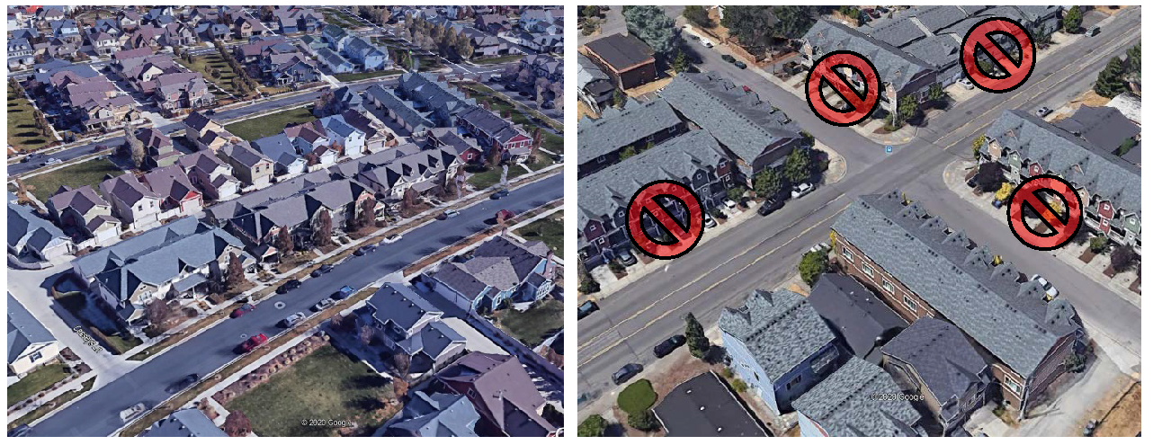 Left: Alley loaded townhouses (South Jordan, Utah) allow for landscaped front yards and inviting streetscapes. Right: The front-loaded townhouse examples are unacceptable because they degrade the streetscape and pedestrian environment and increase safety conflicts on public streets.