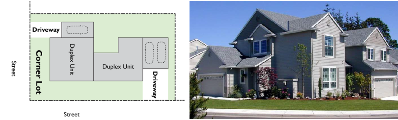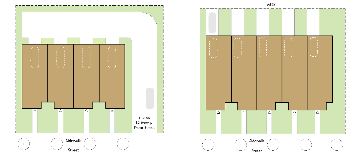 Both examples show a driveway with private garages placed to the rear of units. In the left image, there is no alley and access is provided from the street. In the right image, access from an alley is available and access is provided from the alley.