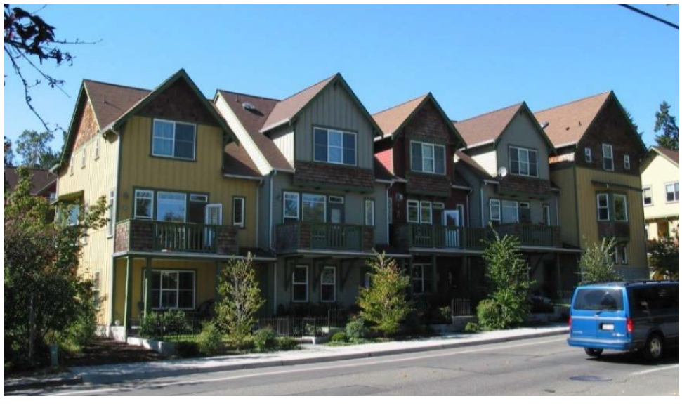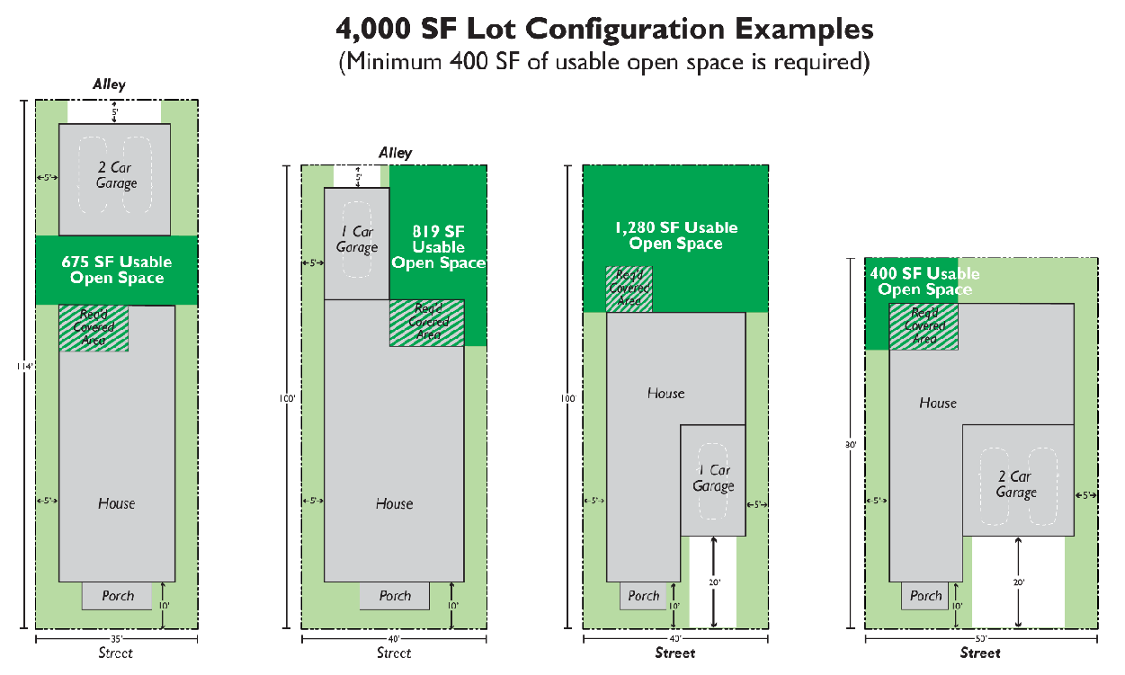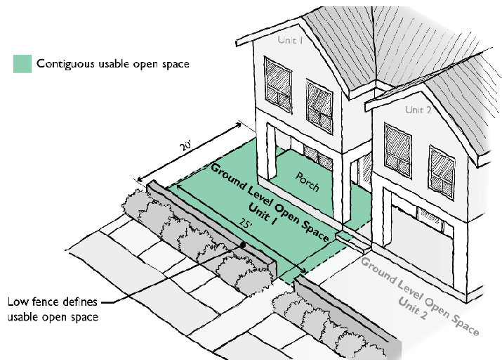 These townhouses utilize a combination of decks and ground-level yards to meet the required open space standard.