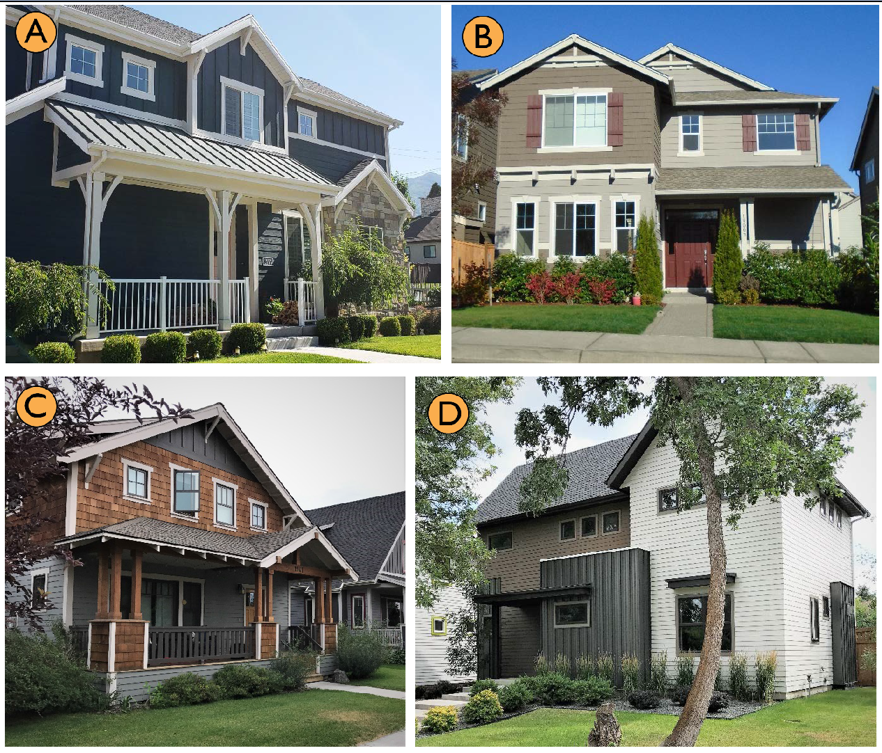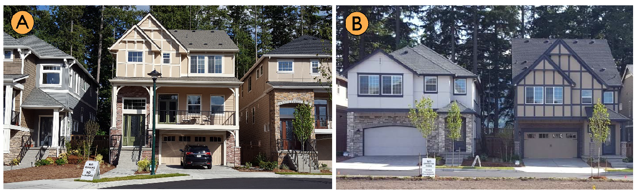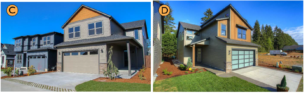 C & D. Alternating articulation (roofline, siding style, color, and window fenestration).