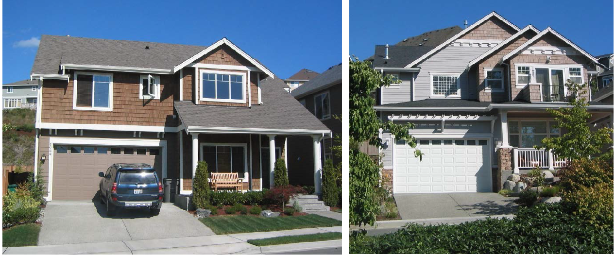 Left: Garage set back from the front covered porch at least four feet. Right: Garage set back less than four feet, and the front façade includes enhanced architectural details including a covered porch, variable siding, pillars/posts, balcony, and other details.