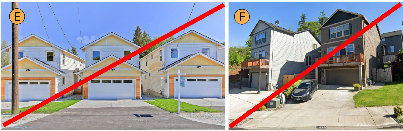 Street-facing driveways and garages.