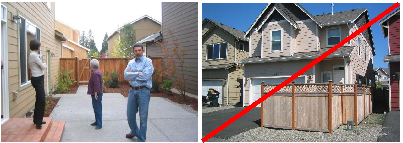 Front yard setbacks may be used to meet this standard, provided they are defined with a low fence (meeting standards of RDC Chapter 17.740, Fences and Walls).