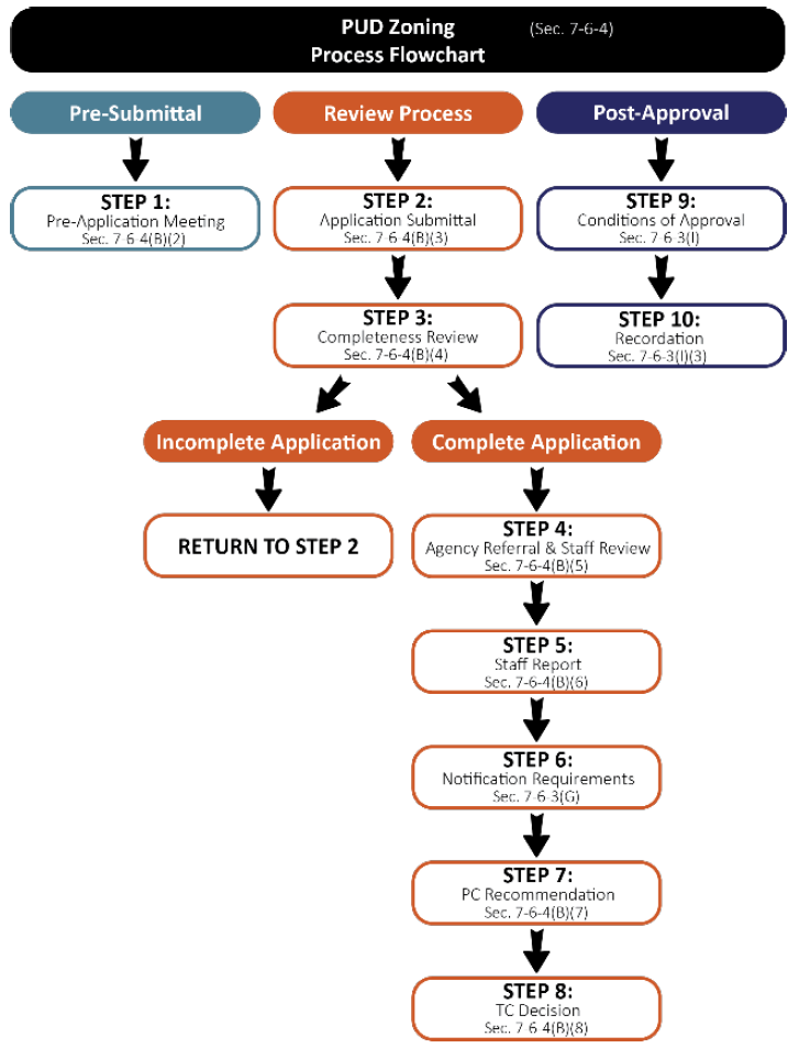 This Subsection outlines the review procedures that are common to all PUD applications. Table T-6.2, PUD Application Types and Processes, identifies the various PUD application types and their associated review procedures regulated by this article. The submittal requirements, review procedures, and approval criteria for each application type is laid out in subsequent sections of this article as identified in Table T-6.2. All documents and materials identified in Section 7-6-3, General PUD Review Procedures and the particular application type section shall be required.