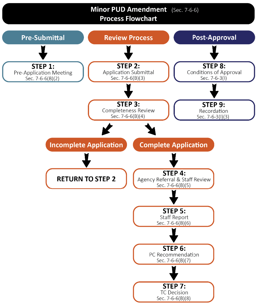 Review Flowchart. Figure F-6.3, Minor PUD Amendment, depicts the minor PUD amendment application review process described in greater detail in this section.