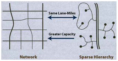 An interconnected street network in the form of a grid-like pattern that eliminates cul-de-sacs is encouraged in order to provide emergency vehicles with at least two (2) access points to each structure, improve pedestrian access and create multiple routes from origins to destinations. This requirement is mandatory for narrower streets to ensure adequate emergency service.