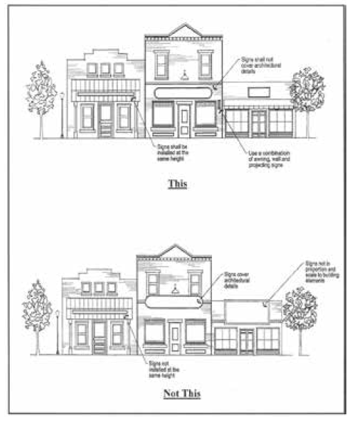 Encourage signs that are responsive to the aesthetics and character of their particular location, adjacent buildings and uses, and the surrounding neighborhood. Ensure that signs are compatible and integrated with the building's architectural design and with other signs on the property.