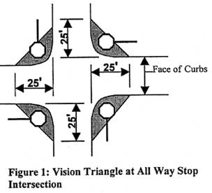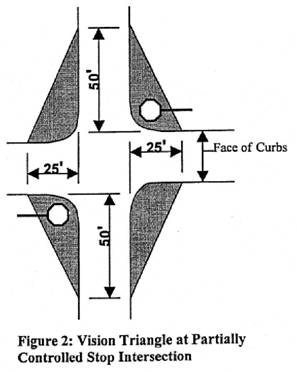 On streets that a have a stop condition at the intersection, the leg of the vision triangle shall extend back twenty-five (25) feet from the nearest face of curb on the cross street being approached. See Figures 1 and 2.