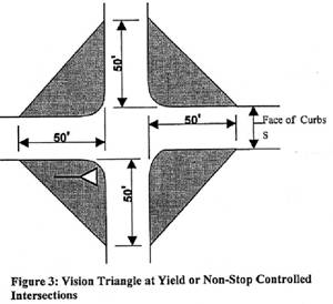 On streets that do not have a stop condition at the intersection, the leg of the vision triangle shall extend back fifty (50) feet from the nearest face of curb on the cross street being approached. See Figures 2 and 3.