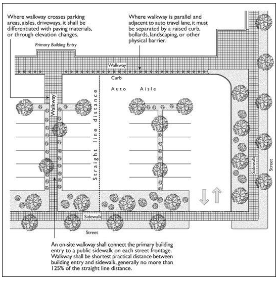 Parking lots proposed along a public street right-of-way shall feature a landscaped area having a minimum width of ten feet measured from the right-of-way to the parking lot pavement. Driveways and sidewalks may cross such landscaped areas, but only at an approximate angle of 90 degrees. All landscape plans shall conform to the standards of section 4.4.1.7, Visibility at intersections.