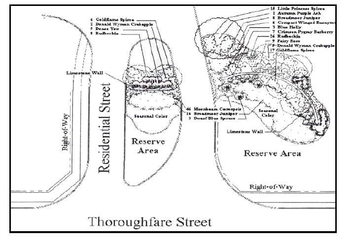 Intersection Clearance: On a corner lot, the intersection clearance zone is an area between the curb line or edge of pavement of the two intersecting streets and a diagonal line connecting the curb or edge of pavement of intersecting streets at a point 30 feet from their point of intersection. In this intersection clearance zone, no fence/wall, ornamental feature, snow fence, mound or hedge shall exceed 36 inches in height above the grade of the edges of the pavement or street gutter except as permitted below.