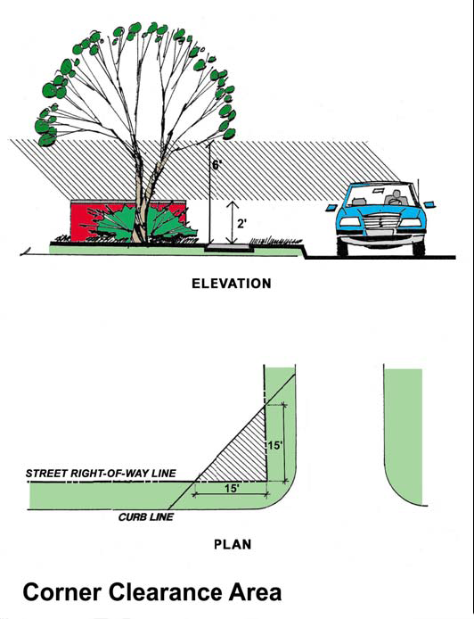 No structures, walls, fences, signs, landscaping or other obstructions to visibility shall be permitted between the heights of two (2) feet and six (6) feet above the existing street grade within a triangular area formed by the intersection of two street right-of-way lines connected by a diagonal across the interior of such lines at points 15 feet from the point of intersection.
