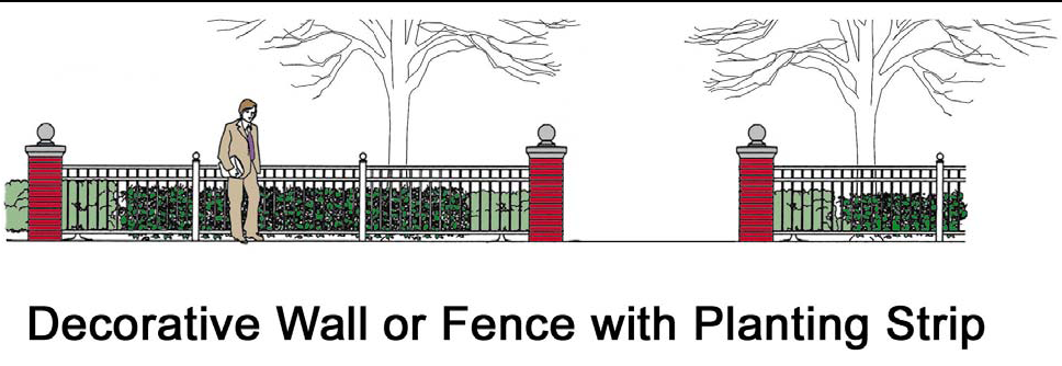 Landscaped screening shall comply with the requirements of Section 14.04E (Screening). If the length of the adjoining residentially zoned property is less than 200 feet, a wall or solid fence with a planting strip a minimum of three (3) feet in width may be erected in lieu of a berm or greenbelt, subject to site plan approval.