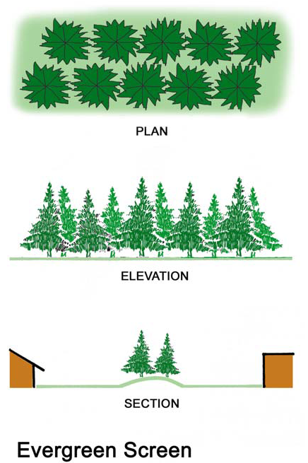 Evergreens must be closely spaced (no further than 15 feet apart) to form complete visual barrier within three (3) years.