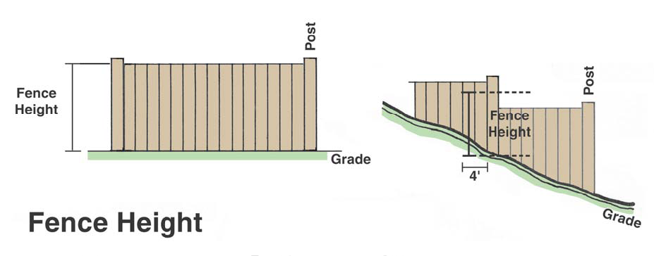 The height of the wall or fence shall be measured from ground level adjacent to the wall or fence to its highest point. Fill shall not be permitted for the purpose of achieving a higher fence than otherwise would be permitted. Where the grade is not level, the maximum fence height shall be equal to the average fence height within four (4) feet of any fence-post.