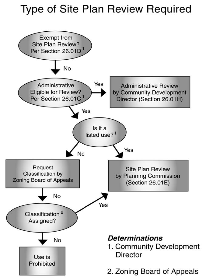 Two separate review processes have been established in accordance with the purpose of this Article. Certain developments or uses, as listed in Section 20.01C, have been determined to be appropriate for a less intensive administrative site plan review. A small number of uses, as listed in Section 20.01D, are exempt from site plan review.