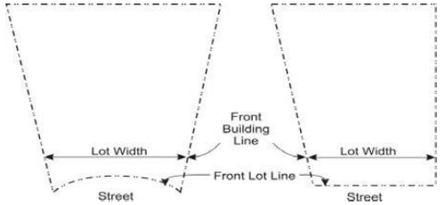 Lot width is measured as the distance between the side lot lines measured at the front building line parallel to the front property line or to the cord of the front property line.