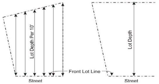 Lot depth is measured as the distance from the front lot line to the rear lot line. Where the front and rear lot lines are not parallel, the lot depth is measured by drawing lines from the front to the rear lot lines, at right angles to the front lot line every ten feet, and averaging the length of these lines.