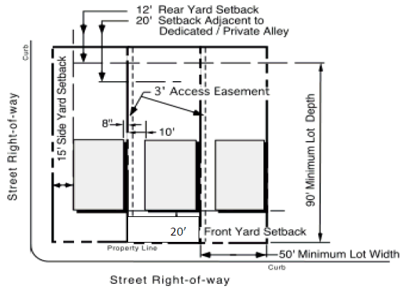 Each lot of a zero lot line development shall provide a minimum of three feet to the adjacent lot as an access or use easement. This easement shall be designated in the side yard adjacent to the adjoining lot's zero side yard. The purpose of this easement is to give the adjoining owner access for maintenance of their dwelling.