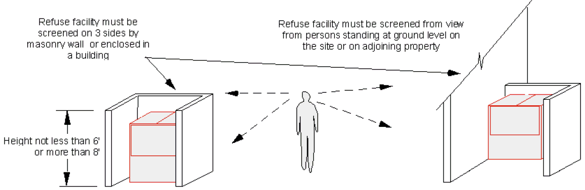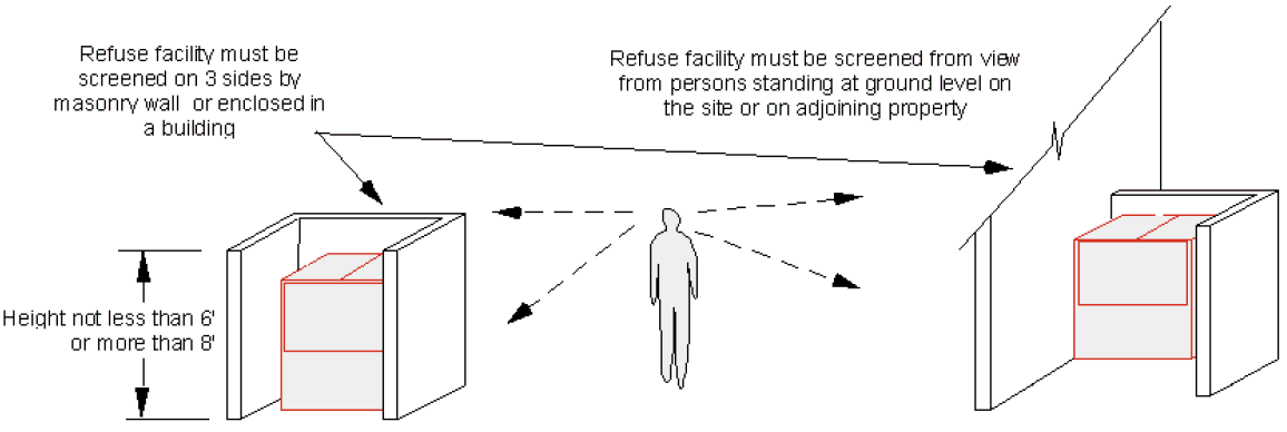 All refuse facilities shall be screened from view on three sides from persons standing at ground level on the site or immediately adjoining property, by a masonry wall not less than six feet, nor more than eight feet in height or by an enclosure within a building.