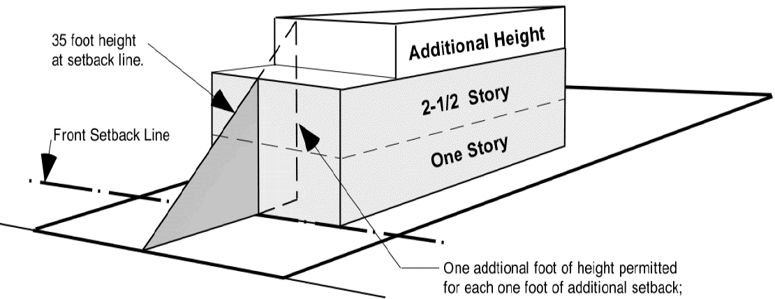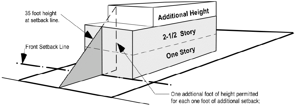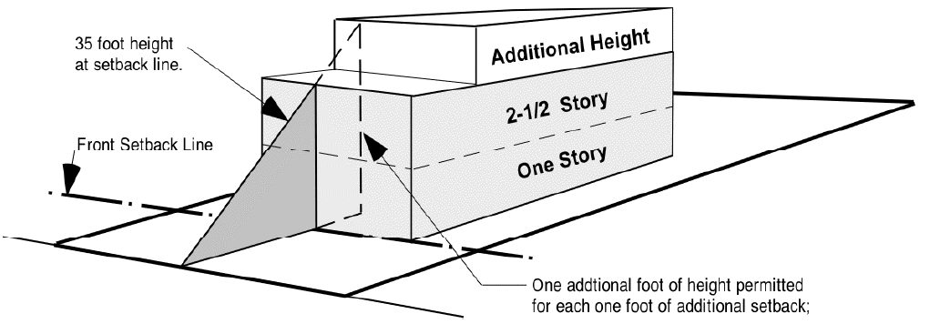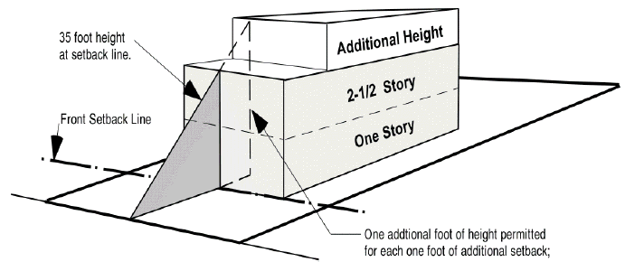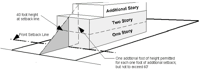 Additional height will be permitted in the "C-1" light commercial district for each additional foot that a structure sets back beyond the required front setback. For each one foot of additional setback the structure will be permitted one additional foot of height; but shall not exceed a total height of 60 feet.