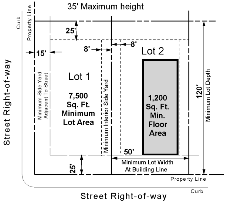 The requirements regulating the minimum lot size, minimum yard sizes (front, side, and rear), maximum building height (stories and feet), and maximum percent of lot coverage by buildings, as pertains to this district, shall conform with the provisions provided in the height and area regulations table for the 2F zoning district.