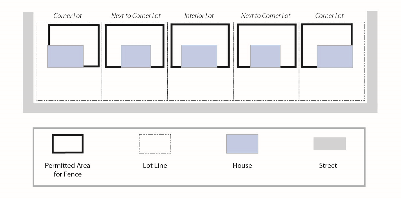 On interior lots, fences or walls will be permitted on rear and/or side yards, extending no further than the front building line.